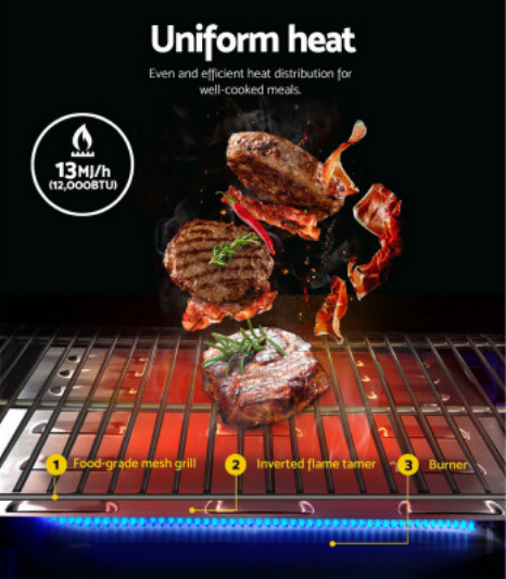 Let's have a BBQ and enjoy some delicious food. The Grillz Portable Gas BBQ is the perfect equipment for BBQ parties, no matter where you are. It's made of high-quality stainless steel, which makes it durable and long-lasting. The BBQ has a fold-up design with retractable steel legs, a large front carry handle, and a locking lid, making it easy to carry around. Some of the excellent features it offers are a double-face grill plate that allows you to cook different styles of food, a 12,000BTU stainless steel U-shape burner that provides high heart conduction for better efficiency, a safe piezoelectric twist start ignition, an integrated thermometer for enhanced cooking, a grease collection tray for easy cleaning after use, and a dedicated flame tamer to prevent food waste from dropping onto the burner. With its large cooking area, the Grillz Portable Gas BBQ is perfect for preparing sumptuous meals in minutes.