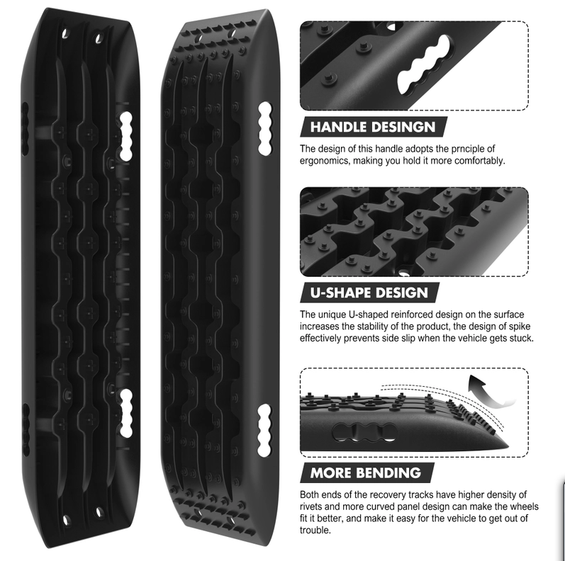 The unique u-shaped reinforced design on the surface increases the stability of the product, the design of the spike effectively prevents side slip when the vehicle gets stuck.